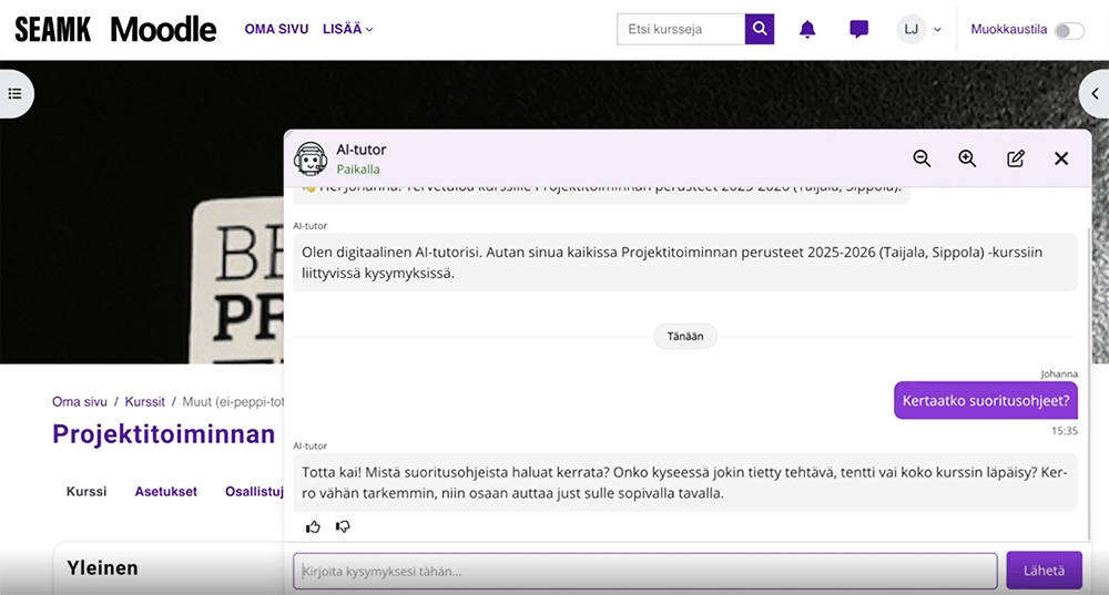 Osana jatkuvaa kehitystä oppimisympäristöön on tuotu myös uusia toiminnallisuuksia, kuten opiskelijalle ohjausta tarjoava AI Tutor. Ratkaisu syntyi konkreettisesta tarpeesta: opiskelijoilla on paljon opintojaksoihin liittyviä käytännön kysymyksiä, kuten mistä tentti löytyy tai milloin se järjestetään.